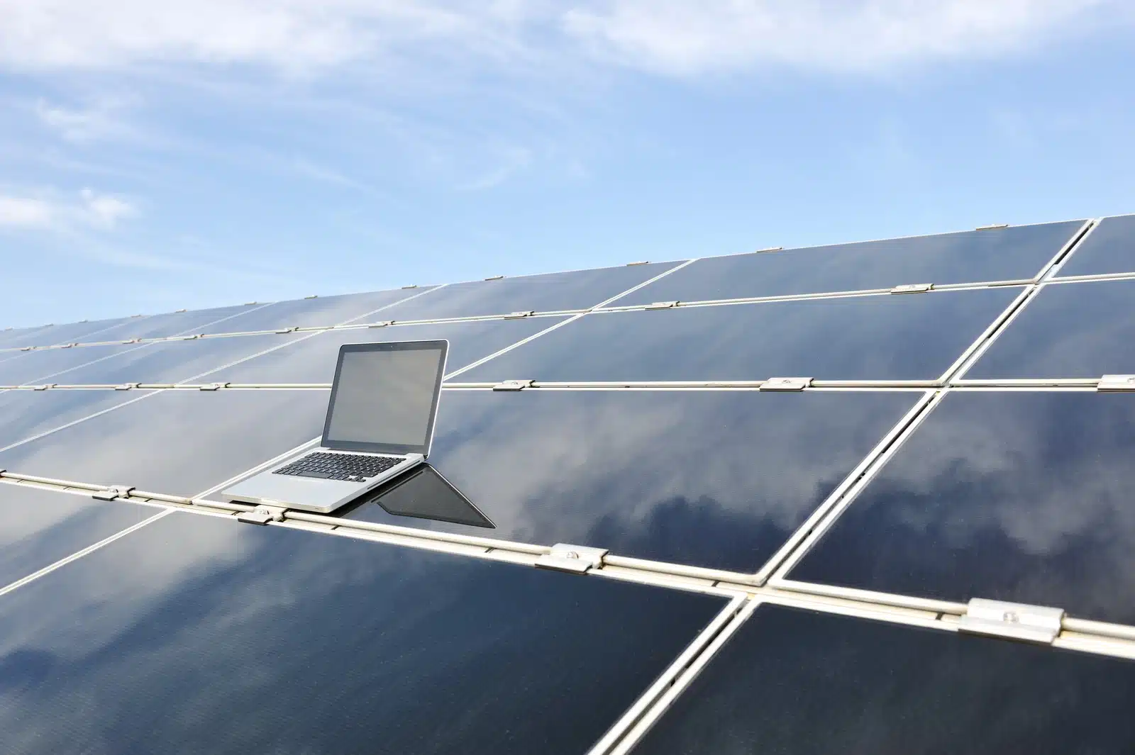Laptop on photovoltaic solar panels against blue sky